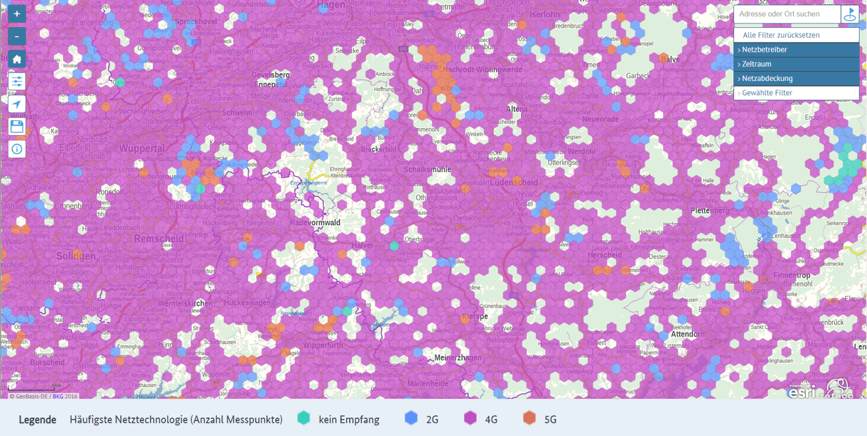 Mit der Breitbandmessung/Funkloch-App können Endkunden die augenblickliche Netzverfügbarkeit ihres Mobilfunknetzes erfassen und so ggf. vorhandene Funklöcher ermitteln. Die individuell erfassten Netzverfügbarkeiten (kein Netz, 2G, 4G, 5G) werden auf ihrem Endgerät gespeichert. Hier finden Sie die bundesweit gesammelten Ergebnisse der Netzverfügbarkeits-/Funklocherfassung als Kartenansicht.
